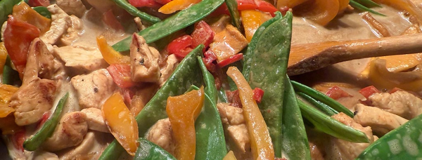 Das Beste an diesem Rezept ist wirklich, dass es so schnell und unkompliziert ist. Hähnchen und Gemüse werden erst erst kross in einer Pfanne angebraten. Ich muss gestehen, ich würde zuerst das Fleisch und dann das Gemüse hinzufügen, damit das Fleisch ein paar Röstaromen erhält. Im Originalrezept wird zuerst die Paprika angebraten und dann das Fleisch hinzugefügt, so wird das Fleisch erst eher gekocht und es dauert länger bis es röstet. Parallel wird ein Sauce im Mixer erstellt aus Erdnussbutter, Sojasauce, dem Saft einer Limette, Korianderstängel und Wasser. Diese kommt zu Fleisch und Gemüse und wird cremig eingekocht. Das klappt wirklich super! Ich war so mutig und habe es für Gäste ausprobiert und es hat reibungslos funktioniert. Genial finde ich auch, dass man so jede Menge Gemüse verzehrt, Paprika und Zuckerschoten harmonieren prima und wenn ihr unterschiedliche Farben bei der Paprika verwendet, ist das Ergebnis auch schön bunt! Kurios fand ich die getrocknete Mango, man könnte sie etwas kleiner schneiden, aber ich war überrascht, sie passte prima!